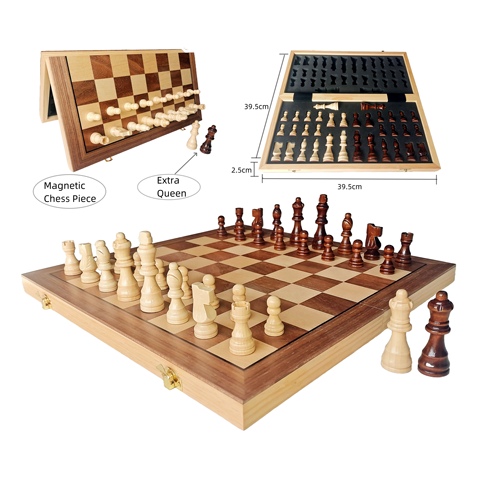 หมากรุกทำด้วยมือแบบคลาสสิกย้อนยุค15นิ้วแม่เหล็กไม้แบบพกพาพับได้กระดานหมากรุกพร้อมหมากฮอส